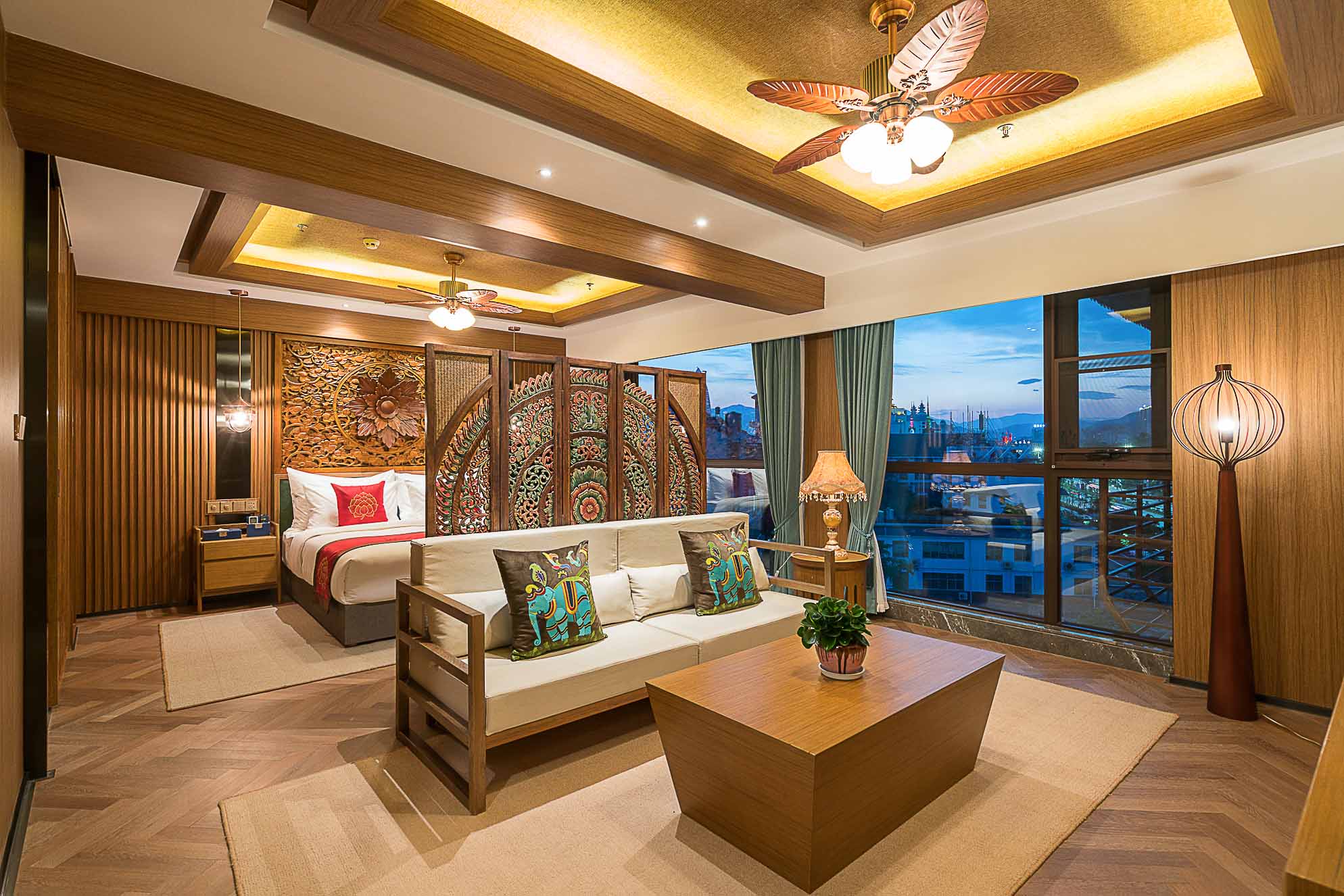 西雙版納泰式主題酒店,保持了泰國本土的風情,建筑不高,給人一種“安靜隱于雨林”的感覺。