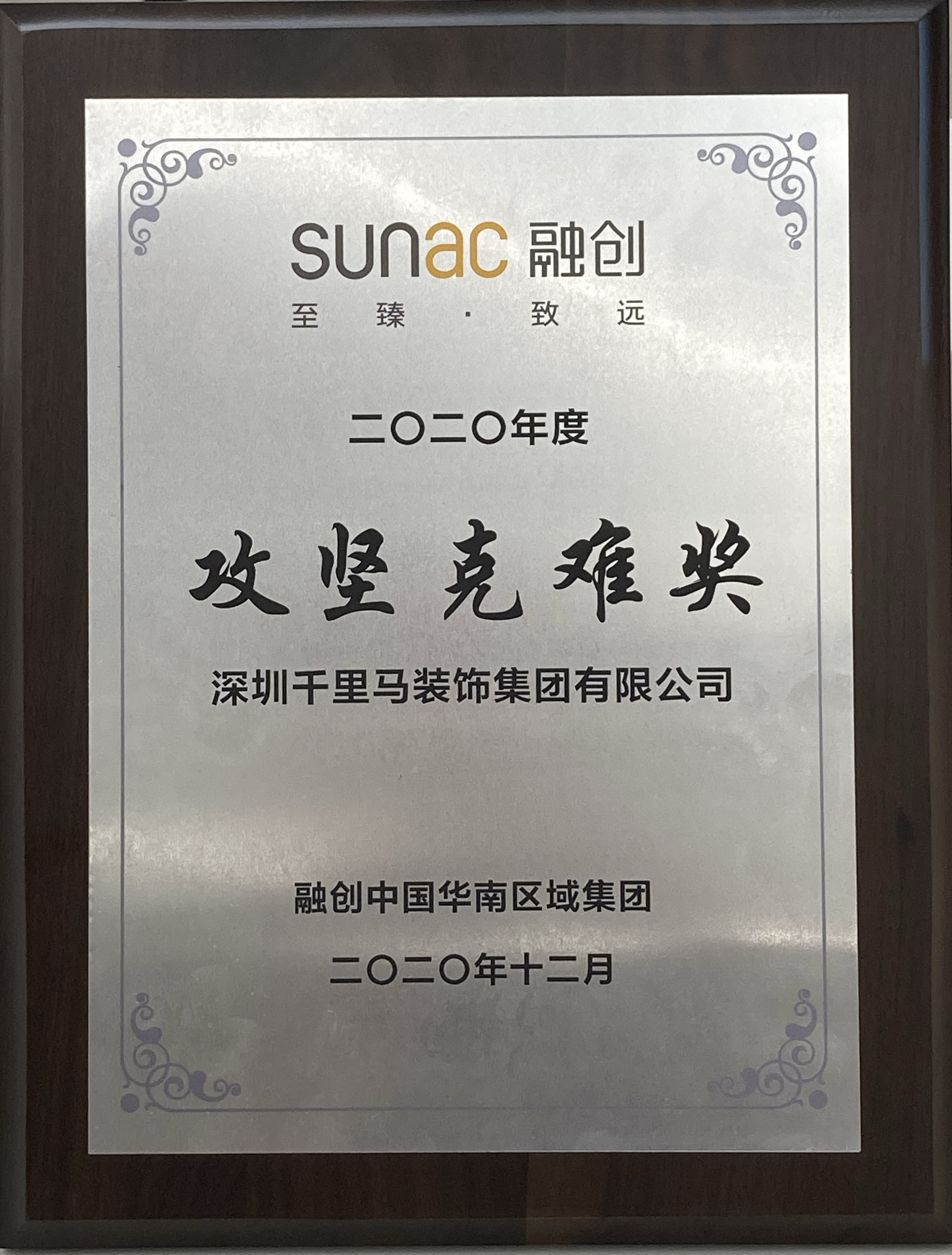 近日,深圳千里馬裝飾集團再獲融創中國華南區域集團頒發的“2020年度優秀供應商”稱號,這是我司自2018年以來連續第三年獲得此項殊榮,此外,我司今年還同時獲得了集團頒發的“2020年度攻堅克難”獎。