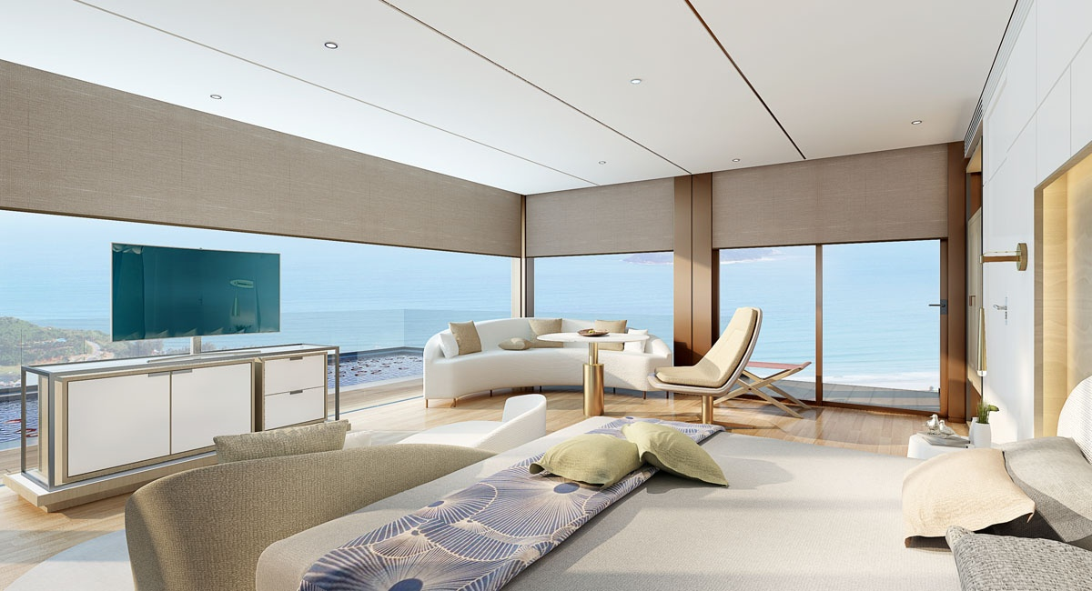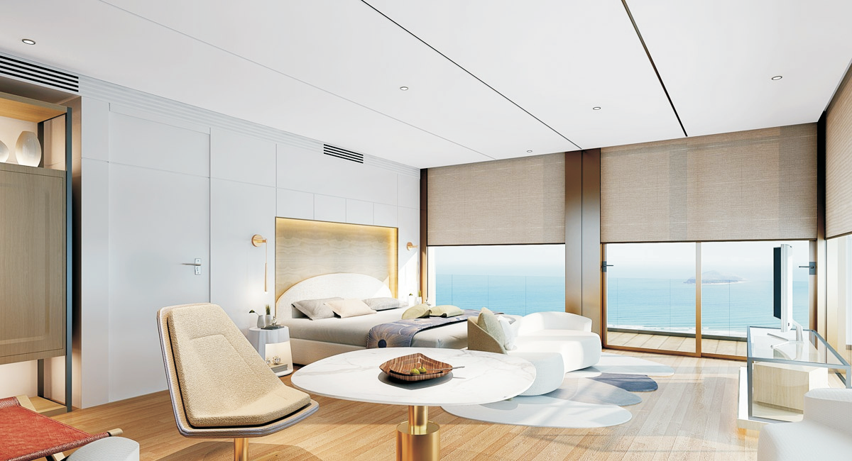 岶勞中集海上酒店項目為集裝箱式獨(dú)立建筑,漂浮在海面上,客房散落在海洋上眾多又美麗,可組合成不同的形狀,美得純粹而原生態(tài),宅在房間里就能欣賞到360一線海景,獨(dú)一無二的眾多海底奇觀。在空間中形態(tài)中,“線”與“形”的元素貫穿場域,流線型幾何塊面的組合貫穿于整個酒店的設(shè)計之中,讓酒店像金石一樣歷久彌新,亦象征這酒店百舸爭流、乘風(fēng)破浪、永攀新高的美好寓意。